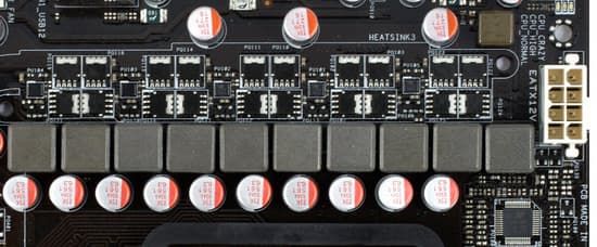 Стабилизатор напряжения питания процессора 10-канальный (2 канала выделены для питания, интегрированного в процессор, северного моста), в каждом канале установлены по 2 высокоэффективных полевых транзистора с Low RDS (on), 10 конденсаторов — по 560 мкФ и 3 — по 270 мкФ, все конденсаторы на плате — твердотельные, японского производства.