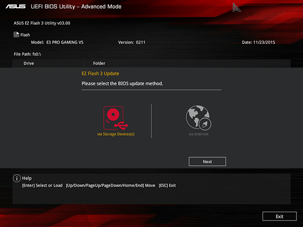 Итак, начнем с того, что, как и на всех платах Asus, на плате Asus E3 Pro Gaming v5 имеется возможность очень просто обновить версию UEFI BIOS, используя для этого традиционную утилиту Asus EZ Flash, встроенную в BIOS. Теперь используется новая версия этой утилиты Asus EZ Flash 3, которая позволяет обновлять UEFI BIOS не только с флэш-накопителя, но и через интернет.