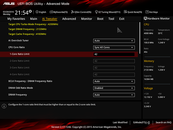 Возможность изменения частоты тактового генератора BCLK в данном случае не предусмотрено, но вот коэффициент умножения ядер процессора можно изменять, причем задавать коэффициент умножения можно как для каждого случая числа загруженных ядер процессора, так и одновременно для всех загруженных ядер процессора.