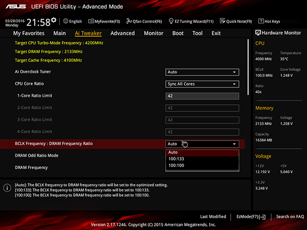В настройках AI Tweaker можно также задавать коэффициент BCLK Frequency : DRAM Frequency (100:100, 100:133) и настроить работу модулей памяти.