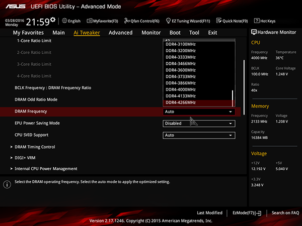 Максимальную частоту модулей памяти DDR4 можно установить равной 4266 МГц — но только установить. Реально максимальная частота памяти составляет 2133 МГц. Напомним, что чипсет Intel C232 не позволяет разгонять память по частоте.