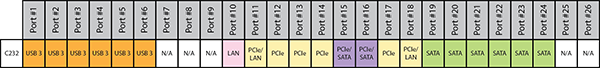 Чипсет Intel С232 обеспечивает до 8 портов (линий) PCI Express 3.0, до 6 портов USB 3.0 и до 6 портов SATA 6 Гбит/с. Причем всего имеется только 21 высокоскоростной порт (USB 3.0, SATA 6 Гбит/с и PCIe 3.0). Часть высокоскоростных портов чипсета строго фиксированы, а часть портов выполнены разделяемыми — они могут быть портами портами PCIe 3.0/SATA 6 Гбит/с.