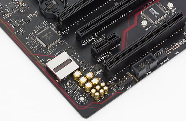 Также имеется контроллер ASMedia ASM1142, под который требуется один или два порта PCIe 3.0, разъем M.2, под который требуется еще два порта PCIe 3.0, а также контроллер ASMedia ASM1083. Добавим к этому наличие слота PCI Express 3.0 x4 и двух слотов PCI Express 3.0 x1. Сетевой контроллер Intel i219-LM (контроллер физического уровня) подключается к выделенному порту чипсета, поэтому его можно не считать.