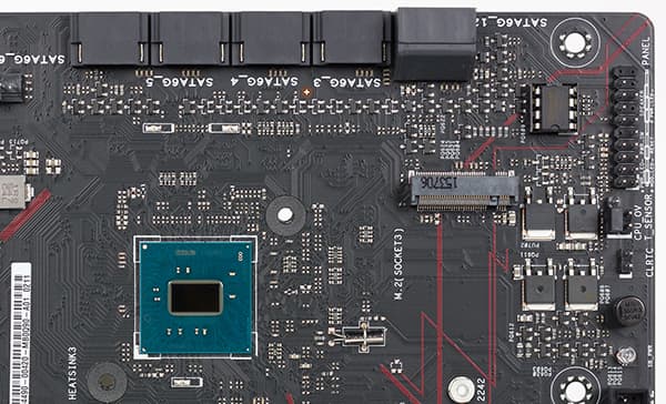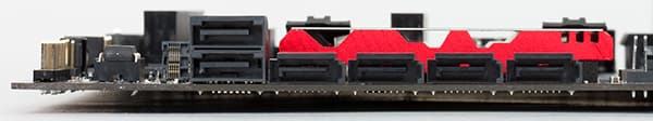 Ну а теперь вернемся к плате Asus E3 Pro Gaming v5. Как мы уже отмечали, на ней реализовано 6 чипсетных портов USB 3.0 и шесть чипсетных портов SATA 6 Гбит/с. Кроме того, еще один порт SATA 6 Гбит/с требуется под разъем M.2, который поддерживает SATA-устройства.