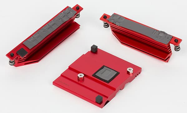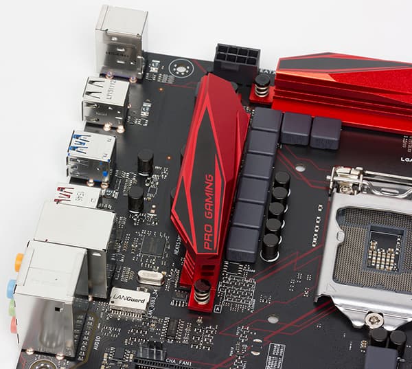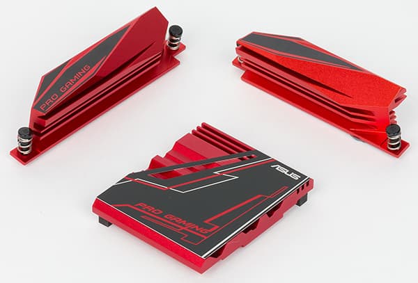 Для охлаждения различных тепловыделяющих компонентов на плате Asus E3 Pro Gaming v5 предусмотрено в совокупности три радиатора. Один отдельный радиатор установлен на чипсете. Еще два радиатора, расположенные по двум сторонам процессорного разъема, закрывают MOSFET-транзисторы регулятора напряжения питания процессора.