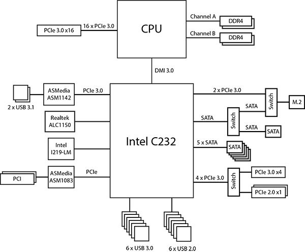 Прежде чем разобраться с тем, как организовано подключение устройств, контроллеров и разъемов на плате Asus E3 Pro Gaming v5, напомним основные особенности чипсета Intel С232.
