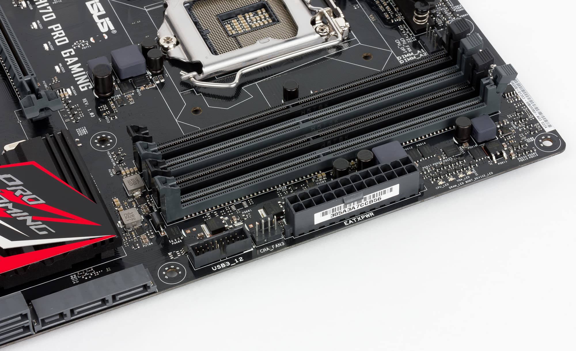 Для установки модулей памяти на плате Asus H170 Pro Gaming предусмотрено четыре DIMM-слота. В руководстве пользователя отмечается, что плата поддерживает небуферизованную память DDR4 (non-EСС) c частотой до 2133 МГц, а максимальный объем памяти составляет 64 ГБ (при использовании модулей емкостью по 16 ГБ).