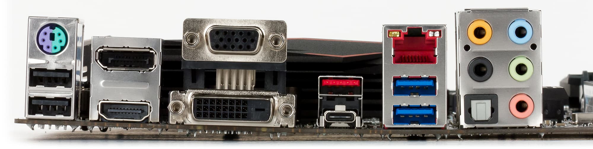 | Разъемы на задней панели | 2× USB 3.0 2 × USB 2.0 1 × USB 3.1 (Type A) 1 × USB 3.1 (Type C) 1 × HDMI 1.4 1 × DisplayPort 1.2 1 × DVI-D 1 × VGA (D-Sub) 1 × RJ-45 2 × PS/2 1 × S/PDIF (оптический, выход) 5 аудиоразъемов типа миниджек |