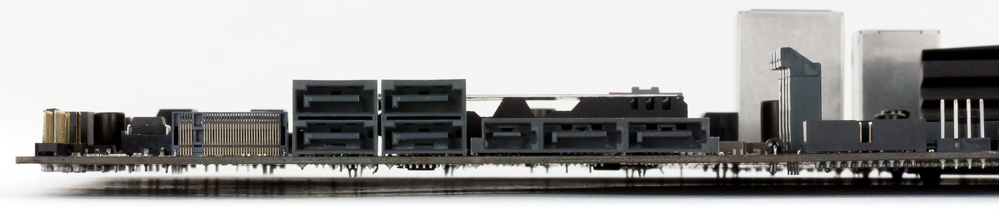 Для подключения накопителей или оптических приводов на плате предусмотрено шесть портов SATA 6 Гбит/с, которые реализованы через чипсет. Два из этих портов SATA 6 Гбит/с используются также в разъеме SATA Express.