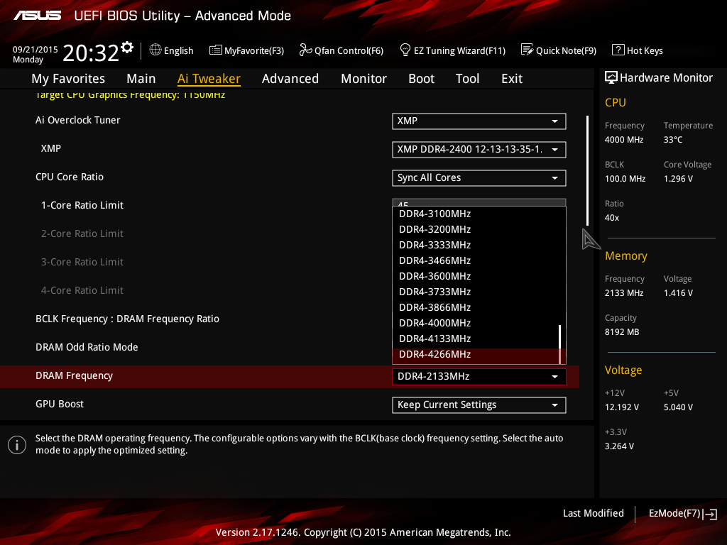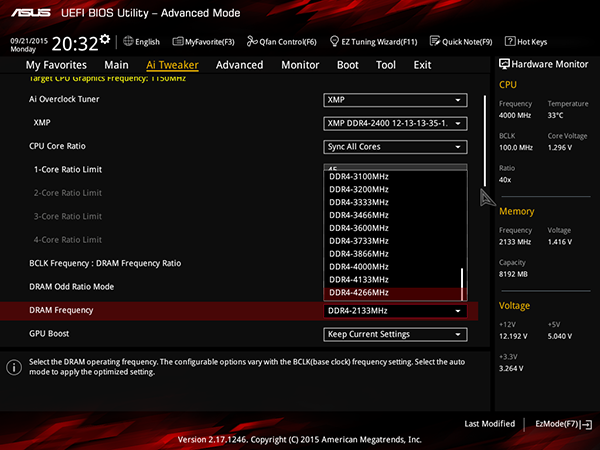 Максимальную частоту модулей памяти DDR4 можно установить равной 4266 МГц, но... только установить. Реально максимальная частота памяти составляет 2133 МГц.