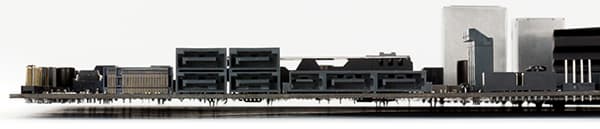 Как мы уже отмечали, на ней реализовано шесть чипсетных портов USB 3.0, то есть даже меньше того количества, которое поддерживает чипсет. А вот портов SATA 6 Гбит/c не хватает. Действительно, на плате реализовано шесть портов SATA 6 Гбит/c, два из которых входят в разъем SATA Express. Кроме того, еще один порт SATA 6 Гбит/с требуется под разъем M.2, который поддерживает SATA устройства.