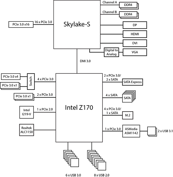 Блок-схема платы Asus H170 Pro Gaming показана на рисунке.