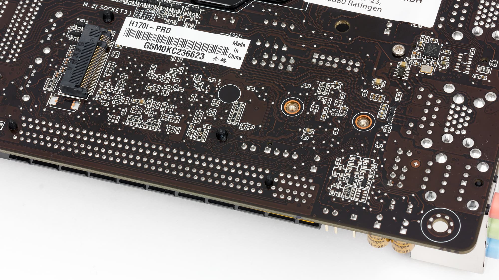 Кроме того, для SSD-накопителя на плате Asus H170I-Pro имеется и разъем M.2, который позволяет устанавливать накопители типоразмера 2242/2260/2280. Сам разъем M.2 расположен с обратной стороны платы, что вполне типично для плат с таким форм-фактором. Отметим, что всего на плате только два отверстия под крепежные винты, а накопитель в типоразмером 2242 можно установить только с использованием специального монтажного удлинителя, входящего в комплект, используя при этом отверстие под накопитель с типоразмером 2260.