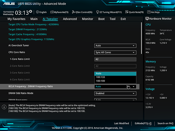 В настройках Ai Tweaker можно также задавать коэффициент BCLK Frequency : DRAM Frequency (100:100, 100:133) и настроить работу модулей памяти.