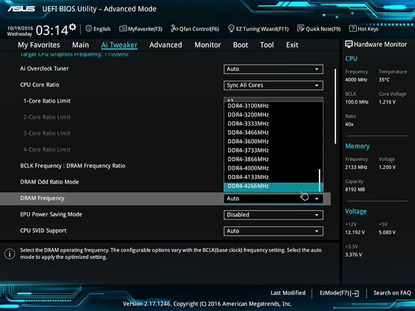 Максимальную частоту модулей памяти DDR4 можно установить равной 4266 МГц, но... только установить. Реально максимальная частота памяти составляет 2133 МГц.