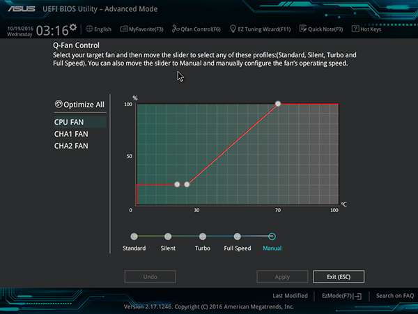 Как и на всех платах Asus, в UEFI BIOS можно настраивать скоростной режим работы всех вентиляторов, подключаемых к плате. Кроме выбора одного из четырех скоростных пресетов, можно настроить скоростной режим вручную по трем точкам на графике зависимости скорости вращения, задаваемой коэффициентом заполнения управляющих PWM-импульсов, от температуры процессора. Для вентилятора кулера процессора минимальный коэффициент заполнения PWM-импульсов составляет 20%, а для двух дополнительных корпусных вентиляторов — 60%.