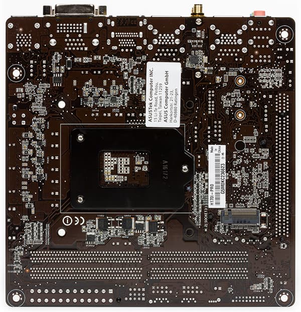 Плата Asus H170I-Pro выполнена в форм-факторе Mini-ITX (170×170 мм), а для ее монтажа в корпус предусмотрено четыре отверстия.