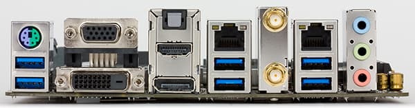 | Разъемы на задней панели | 6 × USB 3.0 1 × DisplayPort 1 × HDMI 1 × DVI-D 1 × D-Sub 2 × RJ-45 1 × S/PDIF (оптический, выход) 3 × аудиоразъемов типа миниджек 2 разъема для подключения антенны 1 × PS/2 |