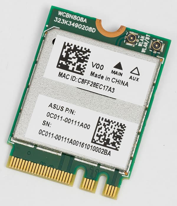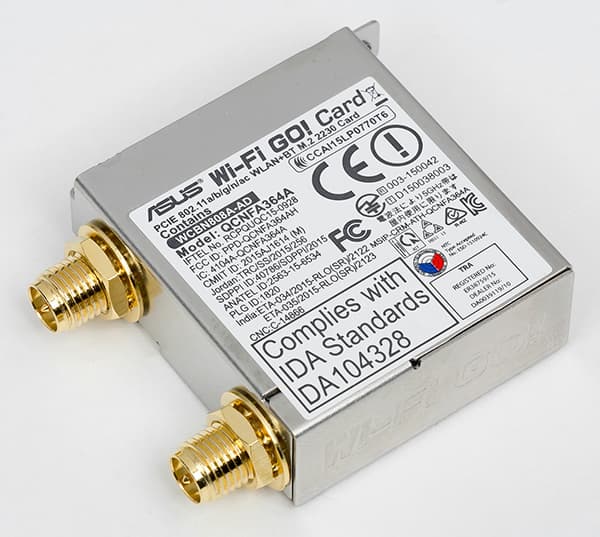 Кроме того, на плате имеется и встроенный модуль Asus WiFi Go!. Это двухдиапазонный (2,4 и 5 ГГц) модуль с поддержкой стандартов 802.11a/b/g/n/ac и Bluetooth 4.1. В основе беспроводного модуля — контроллер Qualcomm Atheros QCNFA364A.