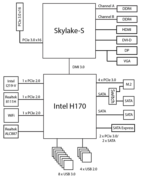 Блок-схема платы Asus H170I-Pro приведена на рисунке.