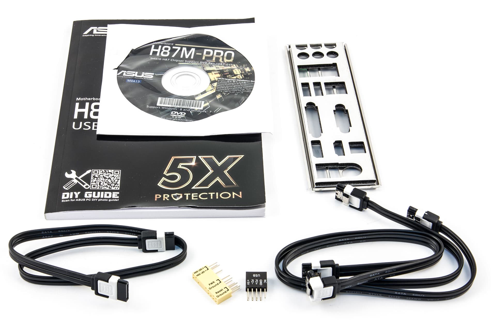 Комплектация платы Asus H87M-Pro в полной мере соответствует концепции бюджетной модели. Плата поставляет в небольшой коробке черного цвета, на которую методом ламинации нанесено название и логотипы поддерживаемых технологий. Кроме самой платы поставляется инструкция пользователя, DVD-диск с программным обеспечением и драйверами, всего три SATA-кабеля (все разъемы с фиксаторами, один кабель имеет угловой разъем с одной стороны), заглушка задней панели платы и традиционный Q-коннектор для облегчения подключения проводов к плате.