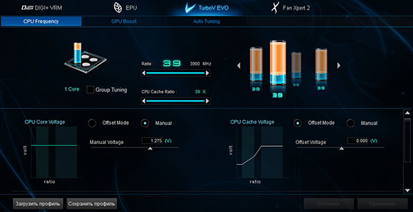Коэффициент умножения ядер процессора можно задавать для каждого случая числа загруженных ядер процессора, а можно задавать одновременно для всех загруженных ядер процессора.