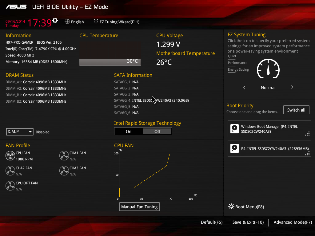 Прежде всего отметим, что традиционно UEFI BIOS имеет два режима отображения: упрощенный информационный режим EZ Mode и режим Advanced, предназначенный для настройки системы.