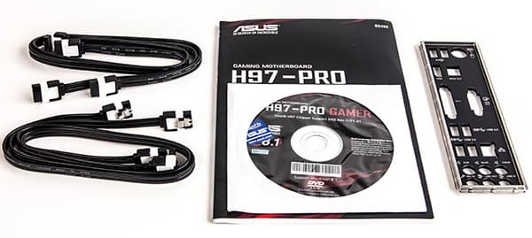 Плата Asus H97-Pro Gamer поставляется в довольно скромной компактной картонной коробке, на которой расписаны все ее достоинства и даже приводится краткая спецификация. Комплект поставки минимальный: кроме самой платы имеется лишь инструкция пользователя, DVD-диск с программным обеспечением и драйверами, четыре SATA-кабеля (все разъемы с защелками, два кабеля имеют угловой разъем с одной стороны) и заглушка для задней панели платы.