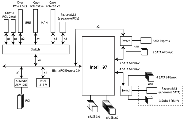Схема подключения всех контроллеров слотов и разъемов к чипсету Intel H97 показана на рисунке.