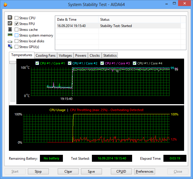 При загрузке процессора стресс-тестом Stress FPU, который в значительно большей степени нагревает процессор, наступал перегрев процессора и режим троттлинга. Частота процессора опускалась до 3,8 ГГц, а его энергопотребление составляло 125 Вт. Но главное, что система при этом не зависала и не «умирала».