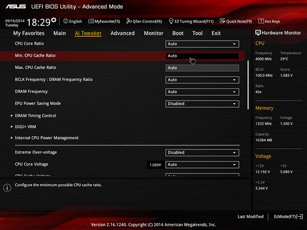 Также на вкладке Ai Tweaker можно отдельно задать минимальный и максимальный коэффициент умножения для кэша L3 (CPU Cache Ratio), настроить режим работы интегрированного в процессор регулятора напряжения питания (IVR) и внешнего регулятора напряжения питания, а также задать напряжение питания на модулях памяти.