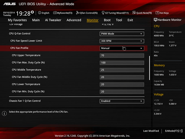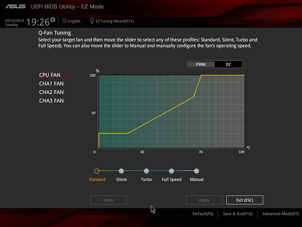Еще одна полезная настройка в UEFI BIOS — возможность управления режимом работы подключенных к плате вентиляторов. Имеется возможность выбрать один из трех предустановленных скоростных режимов (Standart, Silent, Turbo) или по трем точкам задать зависимость скорости вращения вентилятора от температуры.