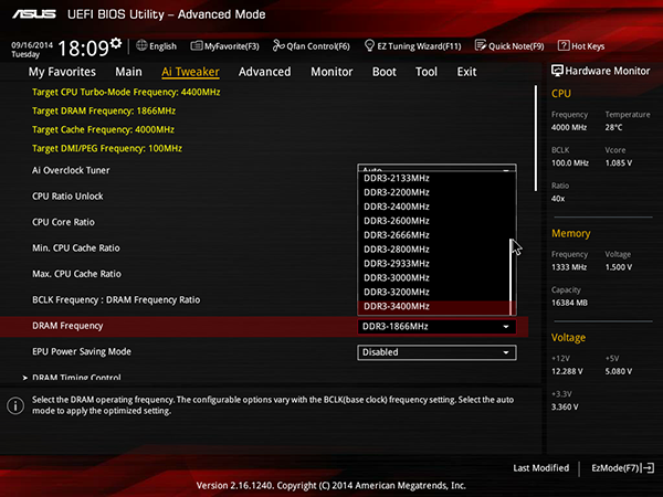 Для разгона системы предназначена вкладка Ai Tweaker, доступная в режиме отображения Advanced Mode. Естественно, самое интересное в данном случае: можно ли разгонять процессор и память или нет. Что касается памяти, то ситуация следующая. В настройках UEFI BIOS формально можно можно выбрать частоту памяти вплоть до 3400 МГц включительно. Однако похоже, что память не разгоняется вообще. Во всяком случае, мы пробовали и с процессором Intel Core i7-4790K, и с процессором Core i7-4770K, но память DDR3-2666 (Corsair) работала только на штатной для этих процессоров частоте 1600 МГц. С учетом того, что с этими же процессорами и этой же памятью никаких проблем не возникало при использовании плат на базе чипсета Intel Z97, можно заключить, что данная плата не позволяет разгонять память (что, вообще говоря, для платы на H97 совершенно нормально).