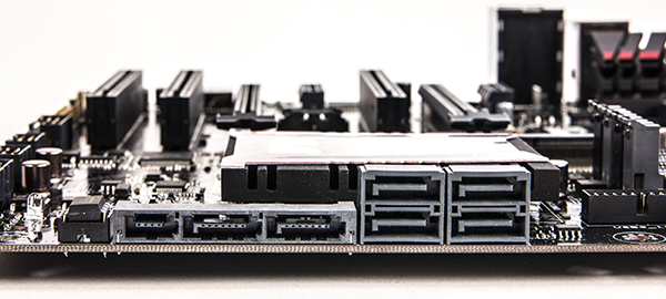 Для подключения накопителей или оптических приводов на плате предусмотрено шесть портов SATA 6 Гбит/с, которые реализованы на базе интегрированного в чипсет контроллера. Из 6 портов SATA 6 Гбит/с два входят в состав разъема SATA Express (естественно, эти два порта могут использоваться не только в составе разъема SATA Express, но и отдельно). Как обычно, все 6 портов SATA 6 Гбит/с поддерживают возможность создания RAID-массивов уровней 0, 1, 5, 10.