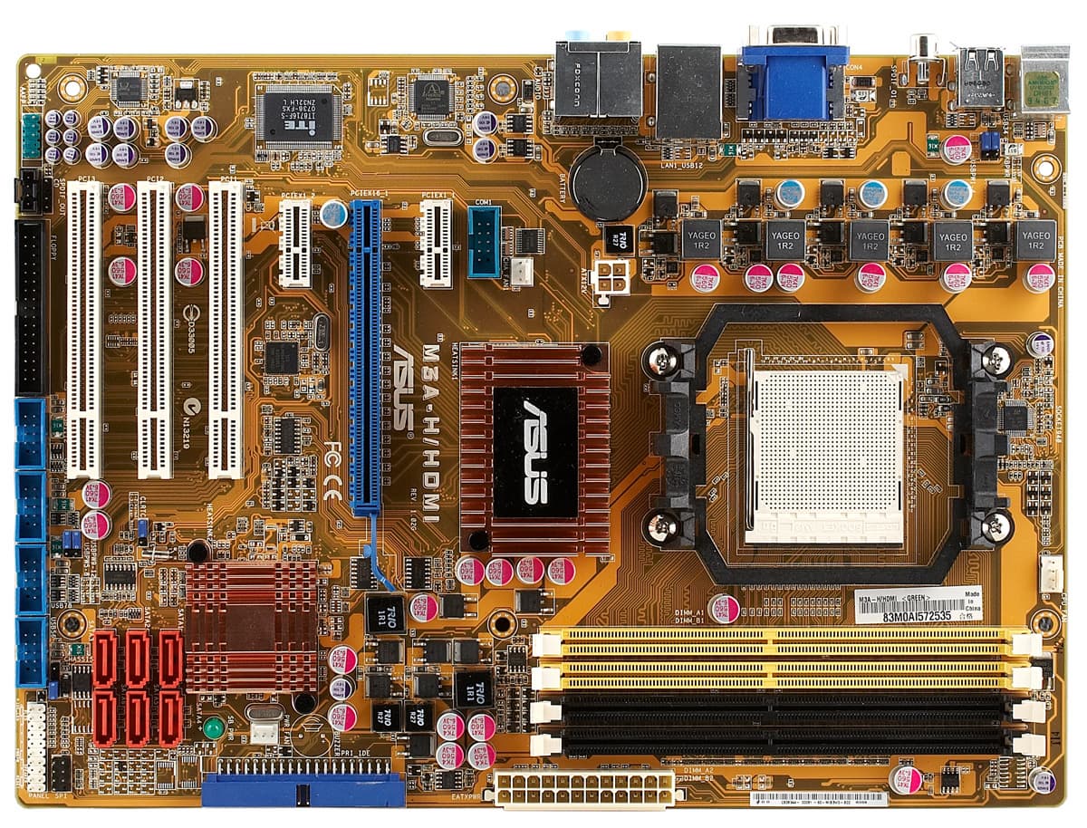 Разведенных, но нераспаянных элементов на плате нет, размер платы — «усеченный» ATX (305×218 мм), крепление к корпусу шестью винтами, правый край, содержащий разъемы для накопителей повисает в воздухе. Кстати, в модельном ряду имеется еще две ATX-платы и две microATX на данном чипсете. И тут необходимо хотя бы виртуально снять шляпу перед такой продуктовой политикой. В отношении ASUS, как и любой другой компании, существуют поводы для критики, но по скорости выпуска новинок и ассортименту, на данный момент, лишь Gigabyte может объективно конкурировать, все остальные либо затягивают с началом поставок, либо имеют гораздо более скудный ассортимент. На первый взгляд, может показаться, что столько похожих плат и не нужно, но на деле это не так, свои ниши имеются у каждой модели. Например, M3A78-EH по функциональности очень схожа с рассматриваемой в этом обзоре, однако не имеет видеовыходов на задней панели (графическое ядро в чипсете может использоваться лишь совместно с видеокартой в режиме Hybrid CrossFire), в целом дизайн упрощен, стоит эта плата весьма недорого и вполне может заинтересовать тех, кто выбирает основу для универсального компьютера с твердым намерением установить видеокарту. В противоположность этой плате, буквально на днях появилась уже почти полная копия M3A-H/HDMI, под названием M3A78 PRO, лишь сама плата увеличена до полного ATX-формата (крепление 9 винтами) и стабилизатор напряжения усилен для поддержки процессоров с TDP до 140 Вт, что может приглянуться любителям экстремального разгона.
