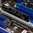 В данном случае графические порты расположены также через двойное расстояние, поэтому двухслотовые карты будут нормально вентилироваться, соответственно, плата выглядит дружелюбно по отношению к любителям мощных игровых систем. Однако тех, кто привык ограничиваться одной картой, в данном случае ожидает не совсем приятный сюрприз. Как следует из описания, полным набором линий PCI Express располагает лишь второй порт, в который и надлежит ставить единственную видеокарту, а первый при этом должен быть заглушен специальной картой. Во всех остальных случаях графические порты располагают только 8 линиями.