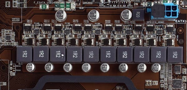 Стабилизатор напряжения питания процессора: 10-канальный (2 канала выделены для питания, интегрированного в процессор, северного моста), установлены по 2 высокоэффективных полевых транзистора с Low RDS (on), 8 конденсаторов — по 820 мкФ и 3 — по 270 мкФ, все конденсаторы на плате — твердотельные, японского производства. Учитывая качественный радиатор на полевых транзисторах, пользователь сможет поставить процессор с TDP до 140 Вт и еще останется запас для разгона.