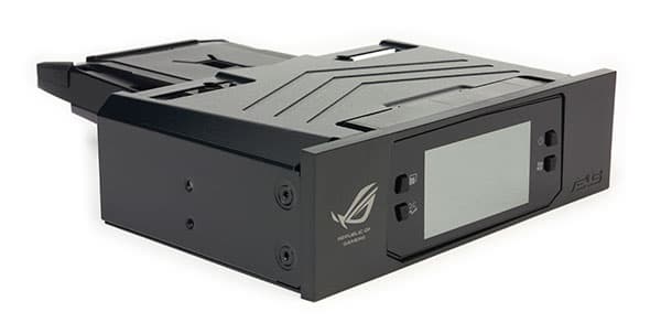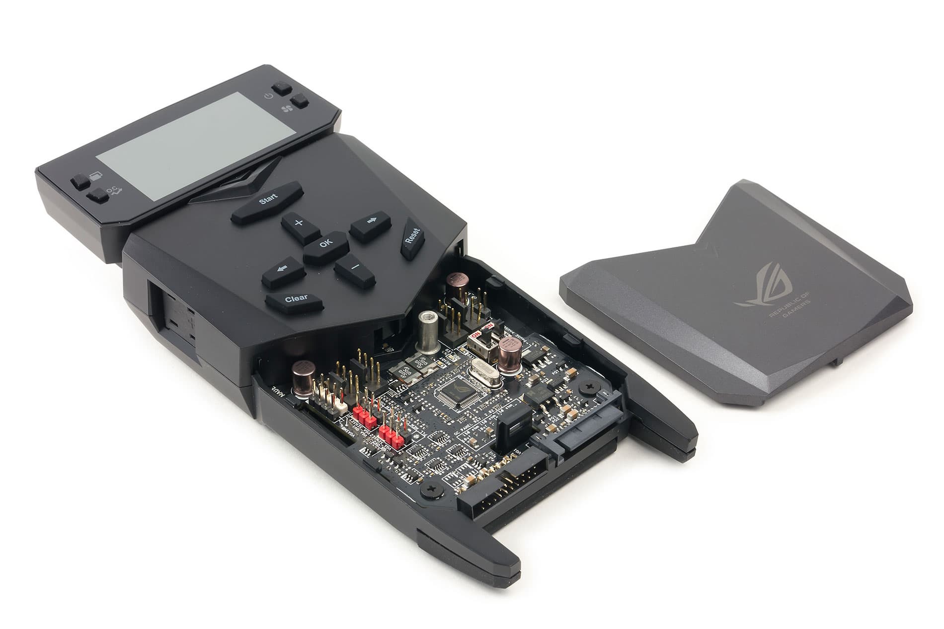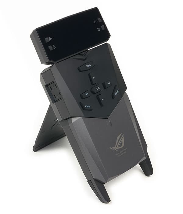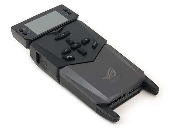 Данная панель подключается специальным кабелем к соответствующему разъему на плате (задействуются одновременно разъем ROG_EXT и разъем для подключения USB 2.0 портов). Кабель, нужно отметить, крайне неудобный. Он довольно короткий, толстый и жесткий и постоянно выскакивает из разъема на панели OC Panel. Этот кабель практически не позволяет удобно разместить панель на столе.