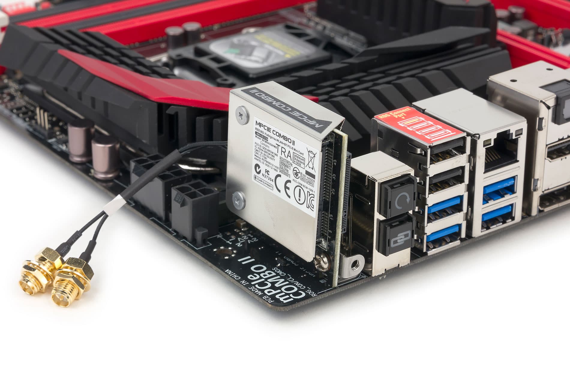 Кроме того, плата комплектуется модулем Wi-Fi+Bluetooth, который устанавливается в разъем Mini PCI Express 2.0 модуля mPCIe Combo II. Собственно, точно таким же модулем комплектуется и плата Asus Maximus VI Formula, о которой мы уже писали.