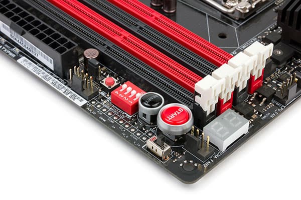 Среди других особенностей платы Asus Maximus VI Extreme стоит отметить наличие кнопок включения и перезагрузки, наличие индикатора POST-кодов, наличие кнопки ClearCMOS (выведена на заднюю панель платы). Кроме того, имеется и традиционная для плат Asus кнопка DirectKey, которая позволяет легко заходить в BIOS, а также кнопка MemOK! для запуска системы в случае установки «необычных» модулей памяти.