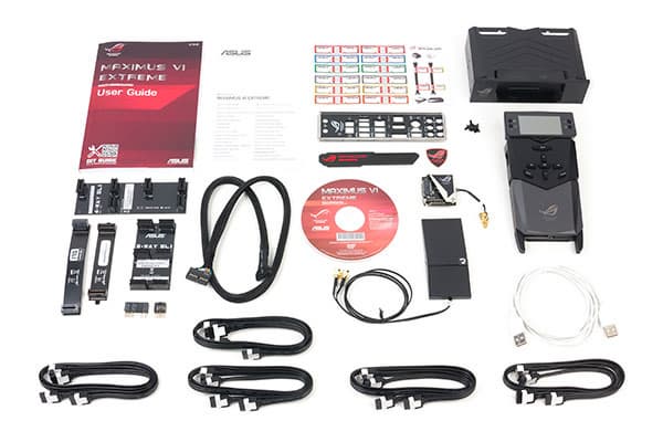 Комплектация платы Asus Maximus VI Extreme впечатляет. Плата поставляется в большой коробке c ручкой, оформленной в бордовых тонах (фирменный цвет для плат семейства ROG). Кроме самой платы поставляется инструкция пользователя (только на английском языке), DVD-диск с программным обеспечением и драйверами, десять SATA-кабелей (все разъемы с защелками, пять кабелей имеют угловой разъем с одной стороны), мостики SLI на две, три и четыре видеокарты, мостик AMD CrossFireX, заглушка задней панели платы, выносная антенна для модуля Wi-Fi+Bluetooth и сам модуль Wi-Fi+Bluetooth, USB-кабель для соединения ROG Connection, выносная панель Asus OC Panel с кабелем подключения и переходник для монтажа панели Asus OC Panel в 5,25-дюймовый отсек корпуса. Как видим, комплектация этой платы уже говорит о том, что перед нами топовый продукт.