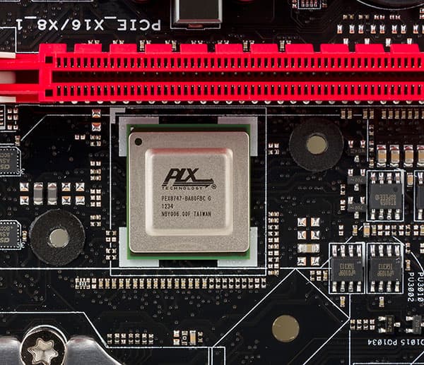 Этот коммутатор подключен к 8 линиям PCI Express 3.0 процессора Haswell, которые он преобразует в 24 (для трех видеокарт) или 32 (для четырех видеокарт) линии PCI Express 3.0.