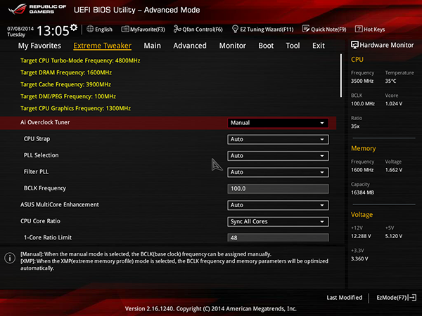 Теперь рассмотрим возможности по настройке и разгону системы, которые можно реализовать через UEFI BIOS на плате Asus Maximus VII Hero. Сразу оговоримся, что по своим возможностям и интерфейсу UEFI BIOS здесь полностью повторяет UEFI BIOS на плате Asus Maximus VII Ranger, а потому мы лишь вкратце рассмотрим основные возможности.