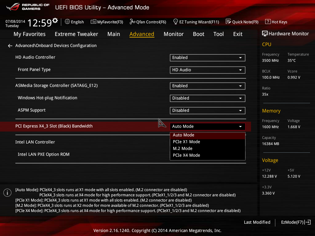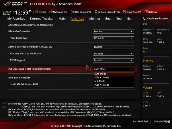 Итак, в UEFI BIOS реализована возможность конфигурирования разделяемых слотов PCI Express x1, PCI Express x4 и M.2. По умолчанию (режим Auto) слот PCI Express x4 работает в режиме x1, все три слота PCI Express x1 доступны, а разъем М.2 недоступен. Для того чтобы изменить режим работы слотов, нужно на вкладке Advanced/Onboard Devices Configuration реализовать настройку режима работы слота PCI Express x4.