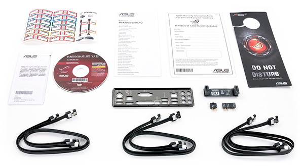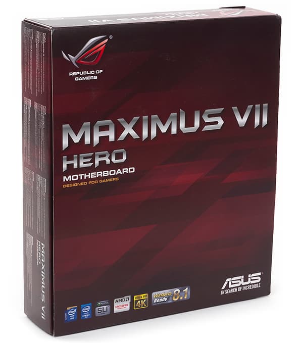 Плата Asus Maximus VII Hero поставляется в компактной коробке бордового цвета, на которой методом ламинации нанесено название платы и логотипы поддерживаемых технологий. Кроме самой платы в комплект поставки входит инструкция пользователя (только на английском языке), DVD-диск с программным обеспечением и драйверами, шесть SATA-кабелей (все разъемы с защелками, три кабеля имеют угловой разъем с одной стороны), мостик SLI, заглушка для задней панели платы и традиционный Asus Q-коннектор для облегчения подключения к плате проводов от кнопки питания, перезагрузки и т. д.