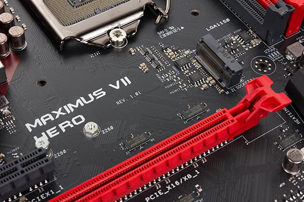 Также на плате Asus Maximus VII Hero имеется и разъем M.2 (PCIe x2), поддержка которого реализована на уровне чипсета Intel Z97. Этот разъем имеет ключ типа M (Socket 3) и поддерживает установку только PCIe-накопителей типоразмера 2260/2280. Для реализации разъема M.2 задействуются две линии PСI Express 2.0.