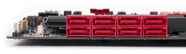 Для подключения накопителей на плате предусмотрено восемь портов SATA 6 Гбит/с. Шесть портов реализованы на базе интегрированного в чипсет контроллера и поддерживают возможность создания RAID-массивов уровней 0, 1, 5, 10