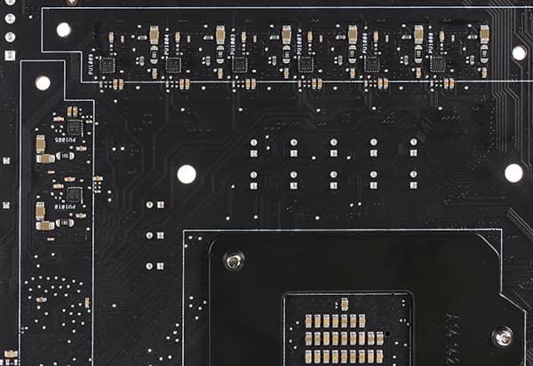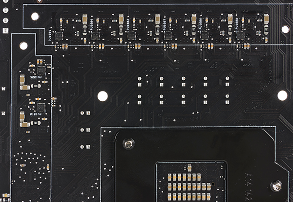 Регулятор напряжения питания процессора на плате является 8-канальным и основан на PWM-контроллере Digi+ VRM с маркировкой APS 1257. Отметим, что MOSFET-драйверы расположены с обратной стороны платы и закрыты теплорассеивающими металлическими пластинами.