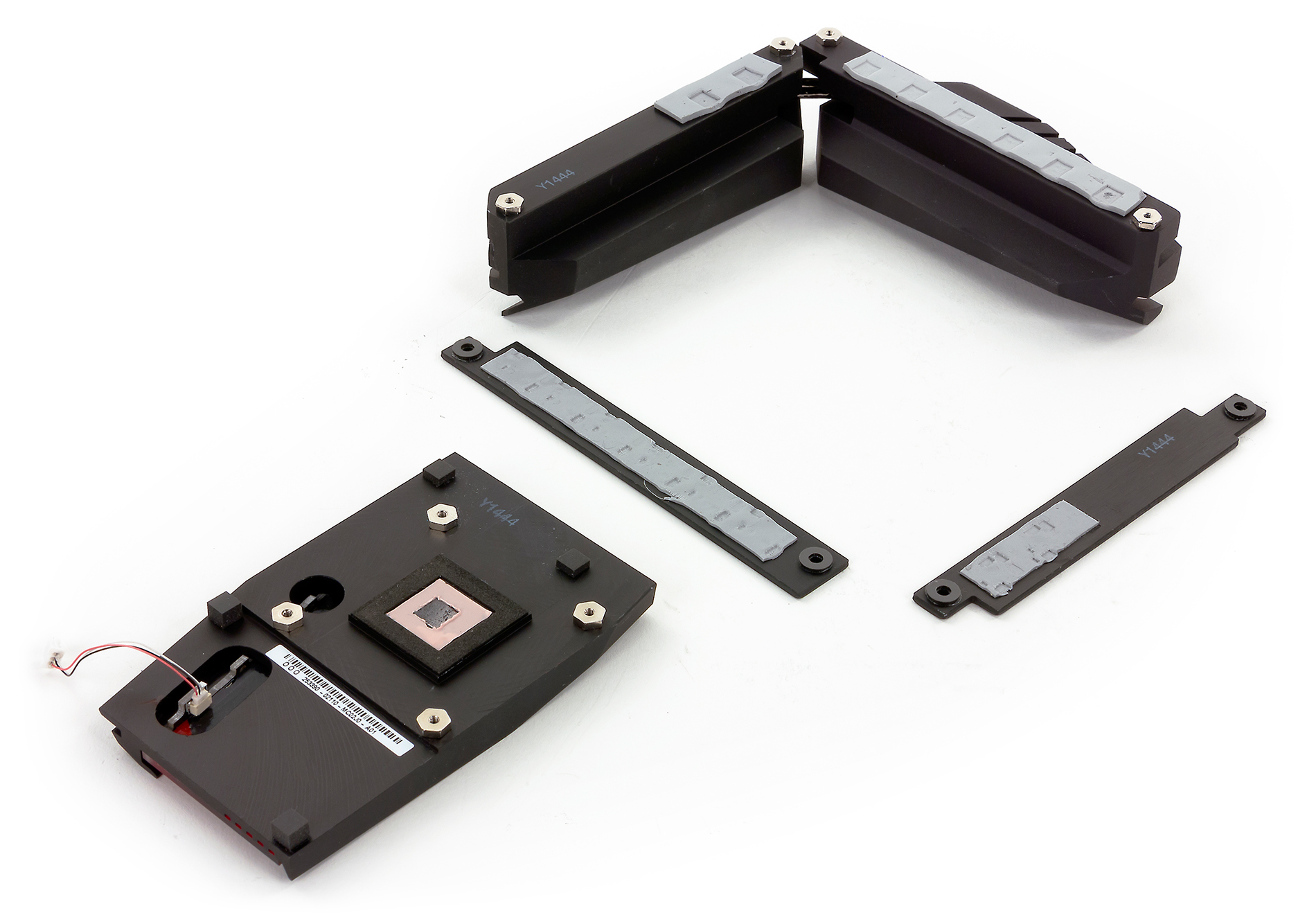 Для охлаждения MOSFET-транзисторов регулятора напряжения питания процессора на плате имеется два радиатора, связанных тепловой трубкой, которые расположены рядом с процессорным разъемом. С обратной стороны платы, как уже отмечалось, на MOSFET-драйверах установлены две теплорассеивающие пластины. Кроме того, еще один радиатор установлен на чипсете.