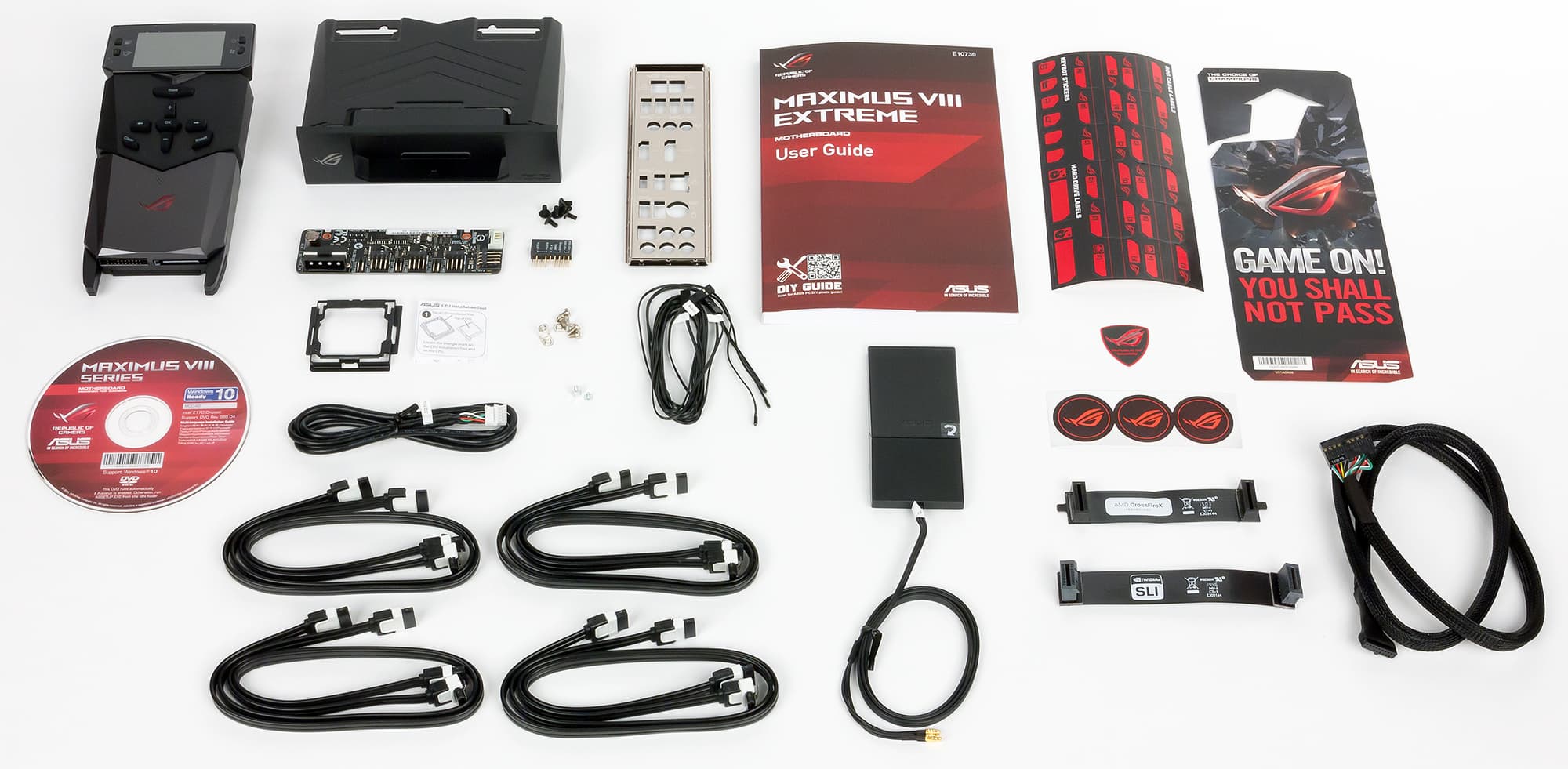 Плата Asus Maximus VIII Extreme поставляется в большой коробке бордового цвета, на которой красноречиво расписаны все достоинства платы. Комплект поставки впечатляет. Кроме самой платы поставляется инструкция пользователя (только на английском языке), DVD-диск с программным обеспечением и драйверами, восемь SATA-кабелей (все разъемы с защелками, четыре кабеля имеют угловой разъем с одной стороны), мостик SLI на две видеокарты, мостик AMD CrossFireX, заглушка задней панели платы, выносная антенна для интегрированного на плате модуля Wi-Fi+Bluetooth, выносная панель Asus OC Panel 2 с кабелем подключения и переходник для монтажа панели Asus OC Panel 2 в 5,25-дюймовый отсек корпуса, а также три выносных термодатчика и отдельная плата для подключения дополнительных вентиляторов. Естественно, есть и Q-коннектор (им комплектуются все платы Asus) для облегчения подключения корпусных проводов к плате. Кроме того, имеется и пластиковая монтажная рамка, предназначенная для установки процессора в разъем (такими рамками комплектуются многие платы Asus). Конечно, этой монтажной рамкой можно и не пользоваться. Просто она предотвращает возможность повреждения контактов разъема при установке в него процессора. Имеются и такие мелочи, как различные наклейки и даже вывеска на ручку двери с просьбой не беспокоить.
